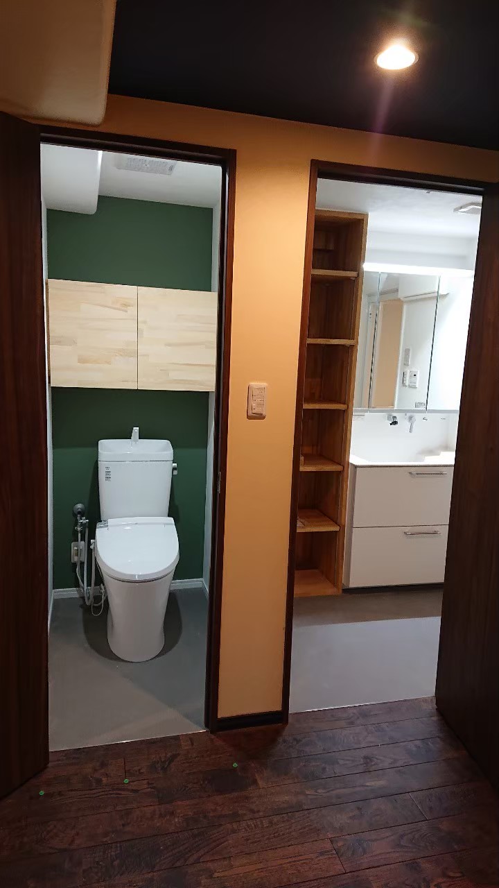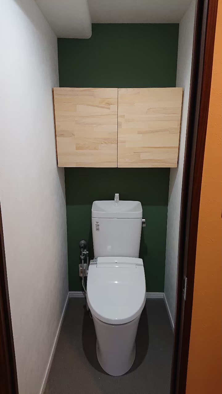 トイレにはアクセントクロス。グリーンの壁で空間をグッと印象的に。