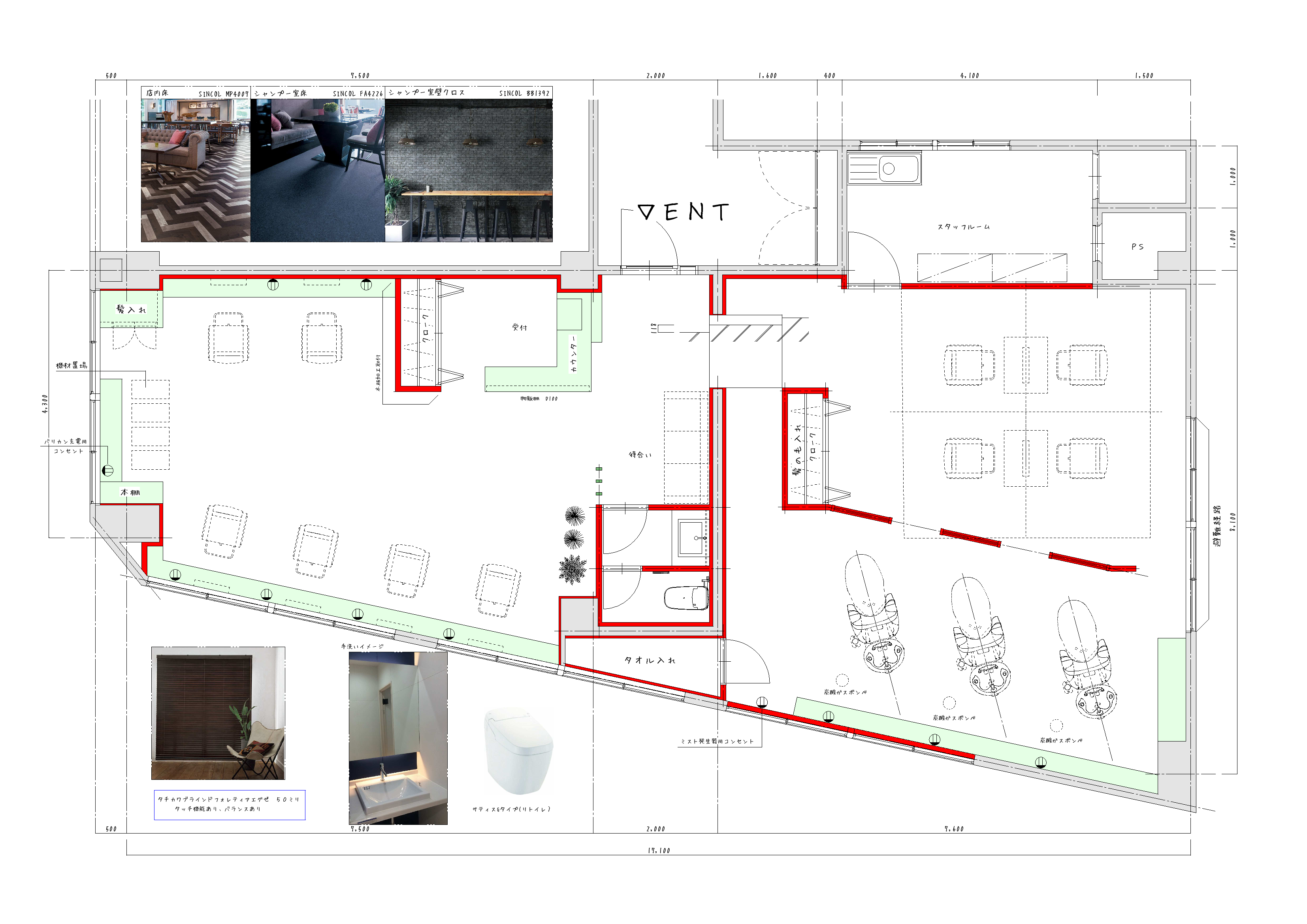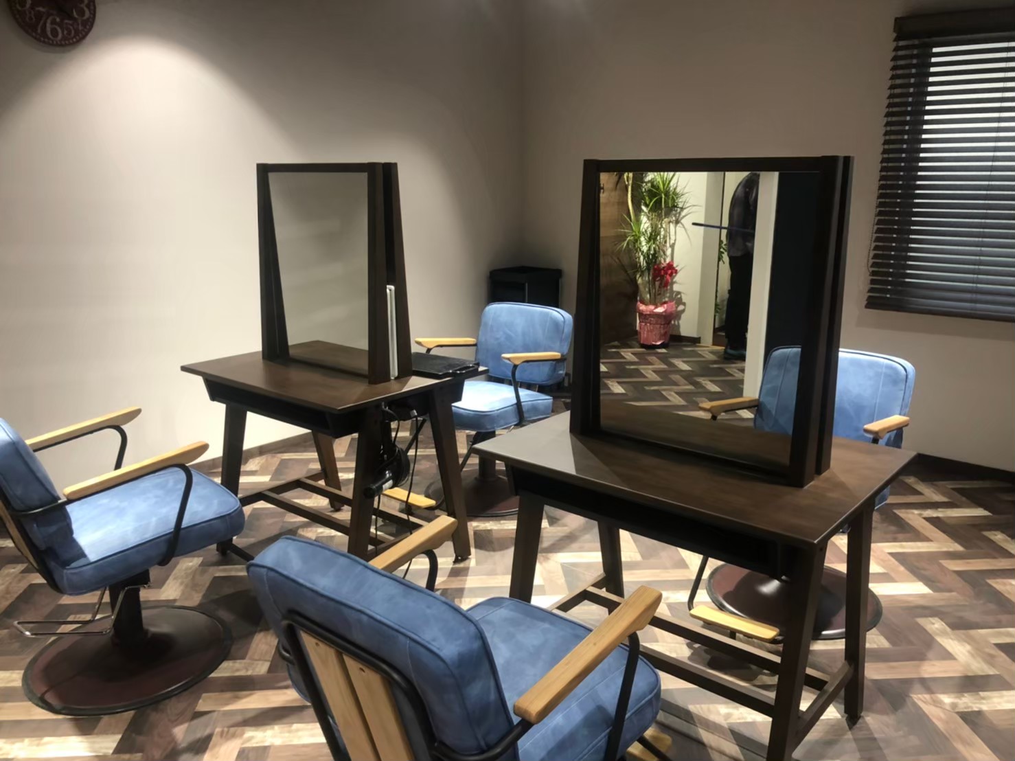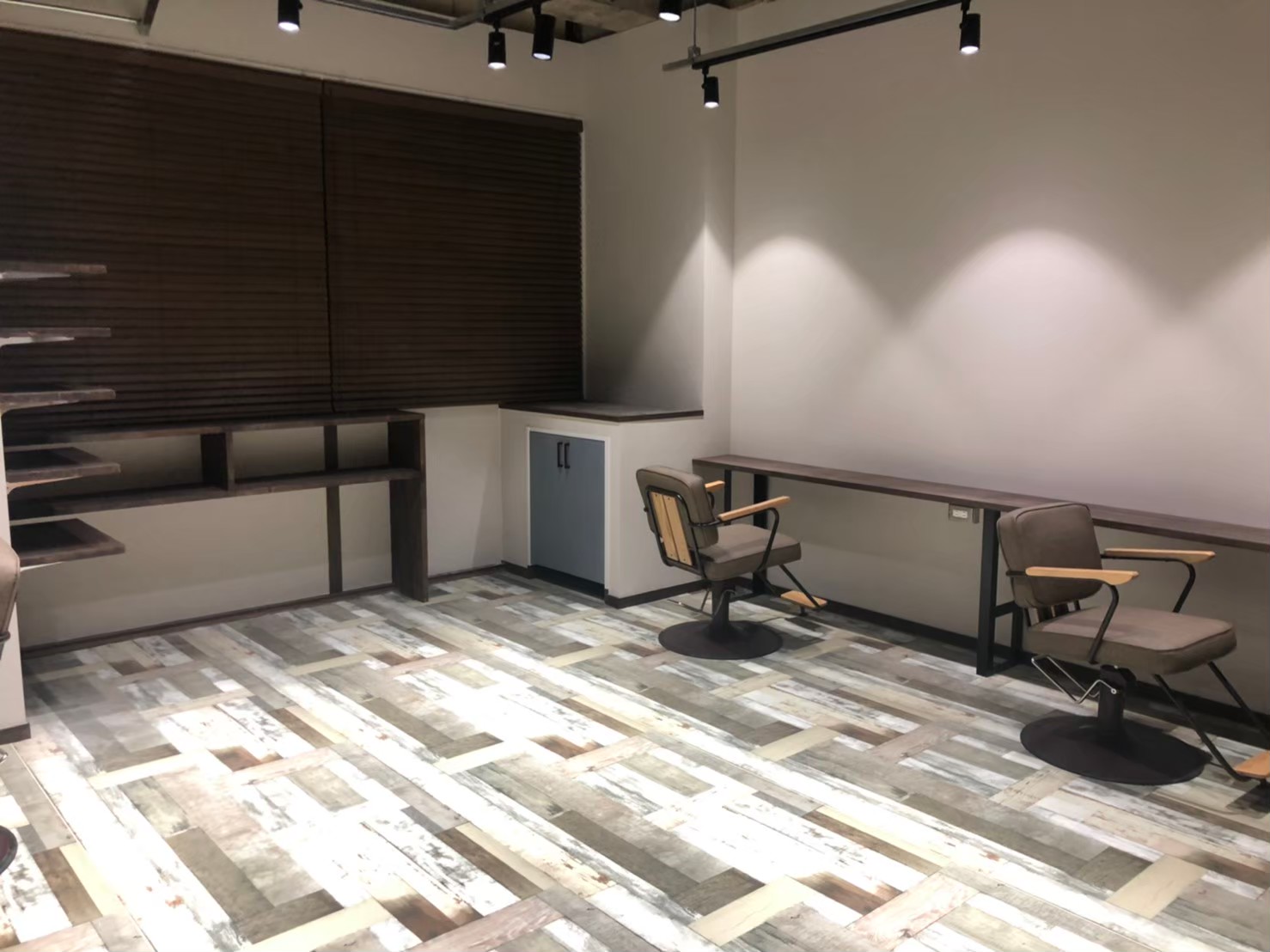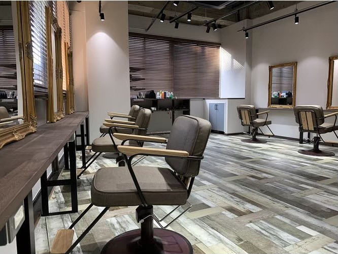 木目調・ウッディテイストの美容室。スポットライトで店内にメリハリをつけ、お客様と働くスタッフをさりげなく演出します。